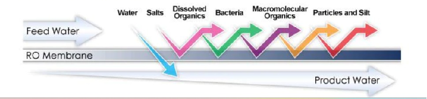 Reverse osmosis system can take salts, Dissolved Organics, bacteria, Macromolecular organics, particles and silts from water and filter into pure water.