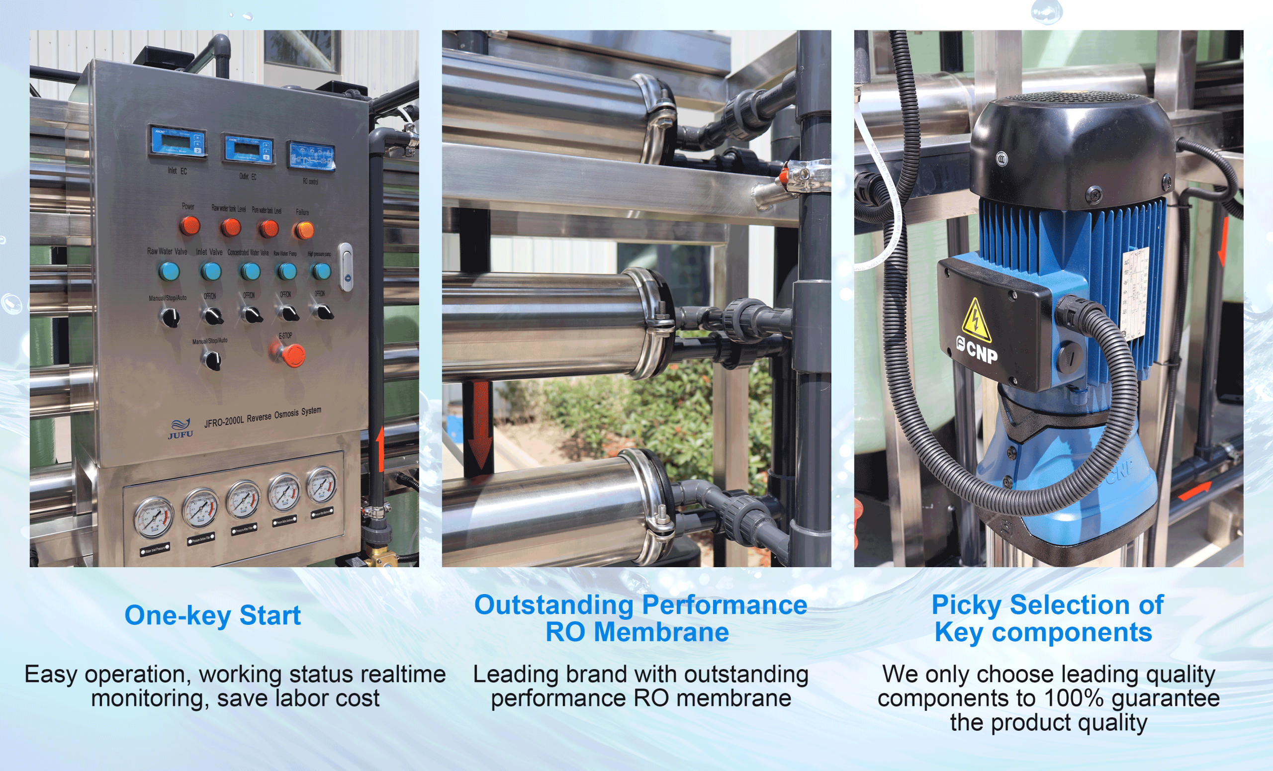 JUFU water 1000lph standard reverse osmosis system can treat the incoming feed water with TDS<2000ppm. No matter the water is coming from borehole, well, river.. if the water’s TDS<2000ppm, you can directly choose our standard RO type.If your water TDS above the range, there are still other options to handle your water, contact our sales engineer, the right model will be recommended to solve your water problem.
