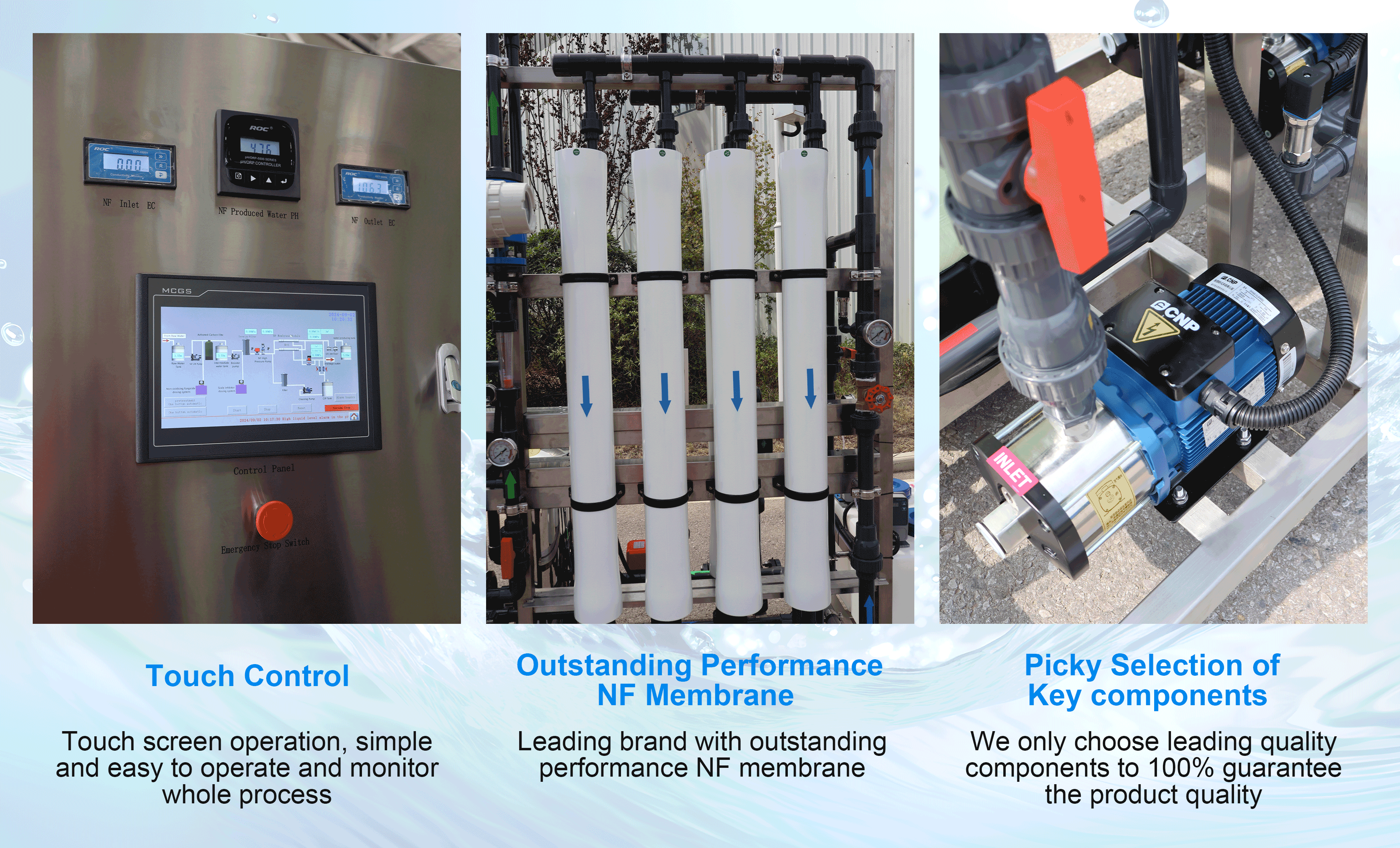 Nanofiltration can retain ions and other particles above divalent, and only water molecules and some monovalent ions (e.g. sodium, potassium, chloride ions) are transmitted. Nanofiltration can be used to produce direct drinking water, the effluent still retains a certain number of ions, and can reduce treatment costs.