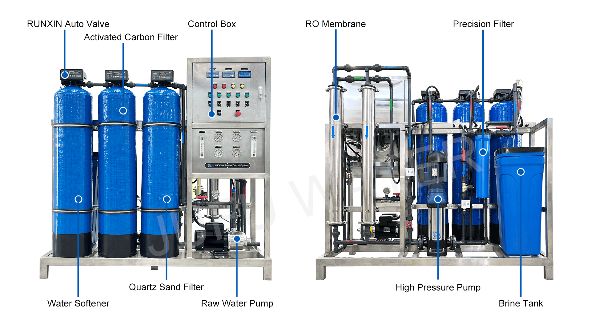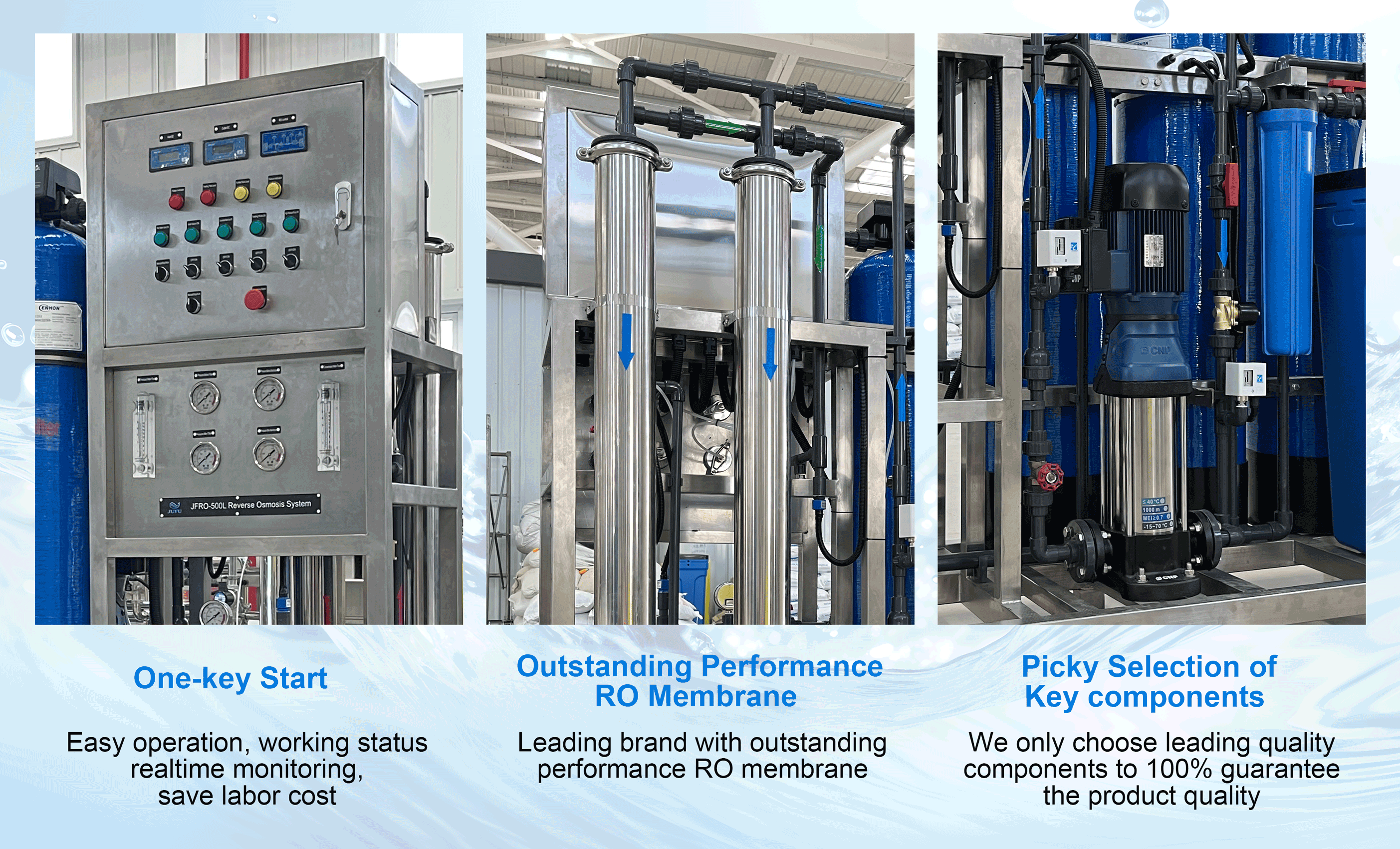 Our team of engineers will select the most suitable size of pre-treatment FRP tank, the amount of filter materials, and the tank material based on the raw water analysis and the purpose of produced water. The pretreatment part usually consists of quartz sand, activated carbon filters and water softener, which is very important for a reverse osmosis system.