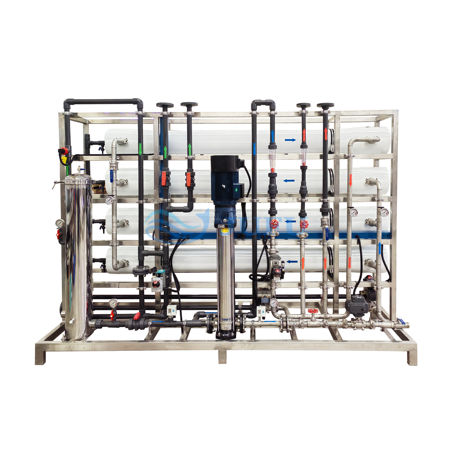 4.Materials and key components applied to produce commercial reverse osmosis system. Solid skid and durable components ensure good operation of the product;
