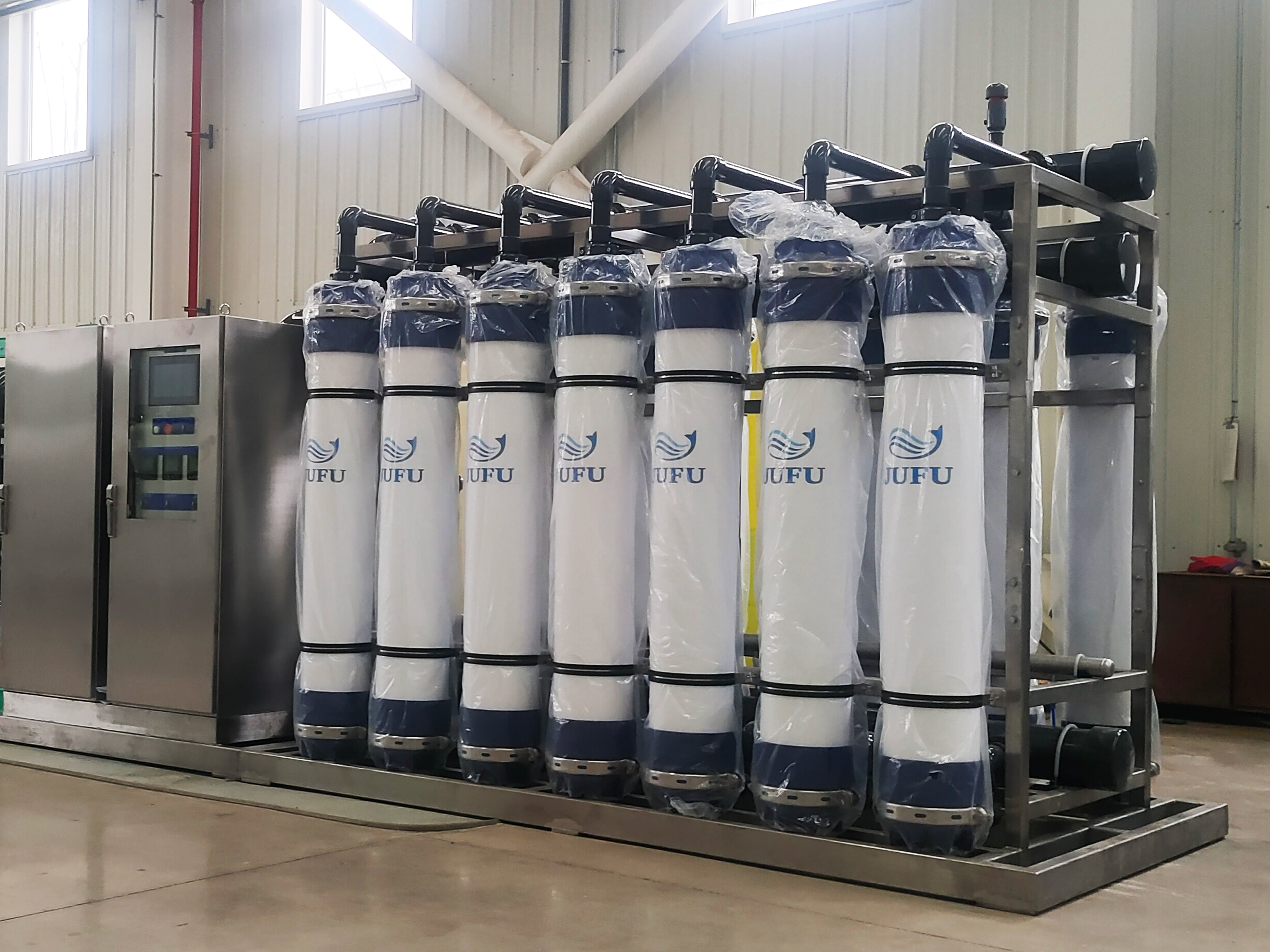 Ultrafiltration (UF) is a membrane separation technology that can purify and separate solutions. The ultrafiltration membrane system is a solution separation device that uses ultrafiltration membrane filaments as the filtration medium and the pressure difference on both sides of the membrane as the driving force. The ultrafiltration membrane only allows the solvent (such as water molecules), inorganic salts and small molecular organic matter in the solution to pass through, while intercepting macromolecular substances such as suspended matter, colloids, proteins and microorganisms in the solution, thereby achieving the purpose of purification or separation. Ultrafiltration membranes are widely used in water treatment projects. Ultrafiltration technology plays an increasingly important role in reverse osmosis pretreatment, drinking water treatment, and reclaimed water reuse. Ultrafiltration technology plays a key role in the sterilization and turbidity removal of alcoholic beverages and beverages, the removal of pyrogens from drugs, and the concentration of food and pharmaceutical products.